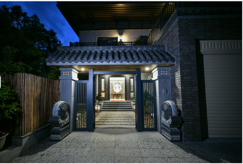 別墅入口位于北端,入戶(hù)大門(mén)、玄關(guān)前庭、會(huì)客廳入口動(dòng)線分明,豎式線條的門(mén)柱,傳統(tǒng)氣質(zhì)的門(mén)頭瓦當(dāng),圓與方的立面對(duì)話,橫與豎的線條演奏,日式與中式元素相得益彰,建筑主體設(shè)計(jì)思想悄然表達(dá)。