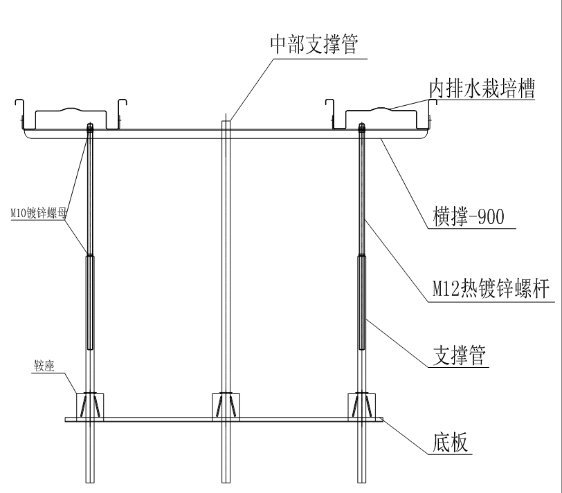 雙排草莓栽培種植系統(tǒng),采用內排水式且連續(xù)生產的鍍鋅高耐候聚酯涂層板栽培槽,防腐好,強度高,排水更通暢,無接頭,避免排水槽對接出現漏水現象。采用內排水截面,有效阻止葉子掉落排水溝引起排水不暢,同時避免陽光直射,導致排水溝滋生青苔綠藻。釆用通長底板支架支撐方式,使支軌道連成一個整體,支撐強度和穩(wěn)固性更好。栽培槽間距:1.6米雙排布置。